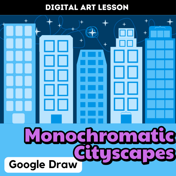 In this digital art lesson, middle school students become designers as they create their own monochromatic cityscapes using Google Draw. The project introduces them to the concept of using one color in a range of tints and shades to build depth and contrast.